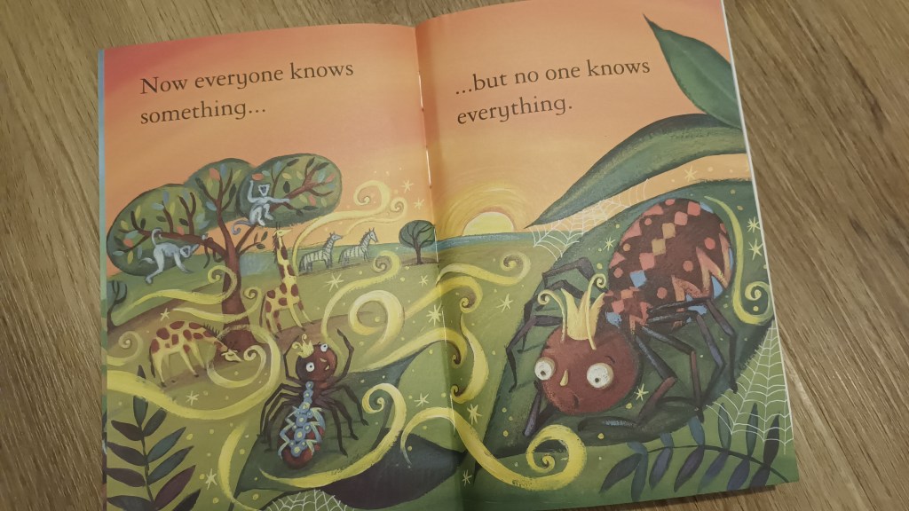 The story of “Anansi and the Bag of Wisdom” Retold by Lesley Sims, Usborne books, was about a Spider King who tried to hide a bag with all the wisdom in the world. He dropped the bag and the bag burst open. Wisdom travelled all over the world so everyone had some and no-one knew everything (A wonderful message for people to respect each other and to work with each other). The pages may have ended but did the story end? Ladies and gentlemen, I present the next chapter.